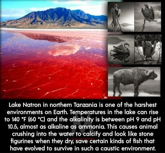 Lake Natron, a place where reality seems to blur with the surreal. This is a land unlike any other, where the earth itself appears to be painted in shades of red, pink, and orange.Stretching for over 35 miles along the Tanzania-Kenya border, Lake Natron stands as a testament to the forces of nature. The water temperature of Lake Natron can reach up to 40 degrees Celsius (104 degrees Fahrenheit) during the hottest months of the year.