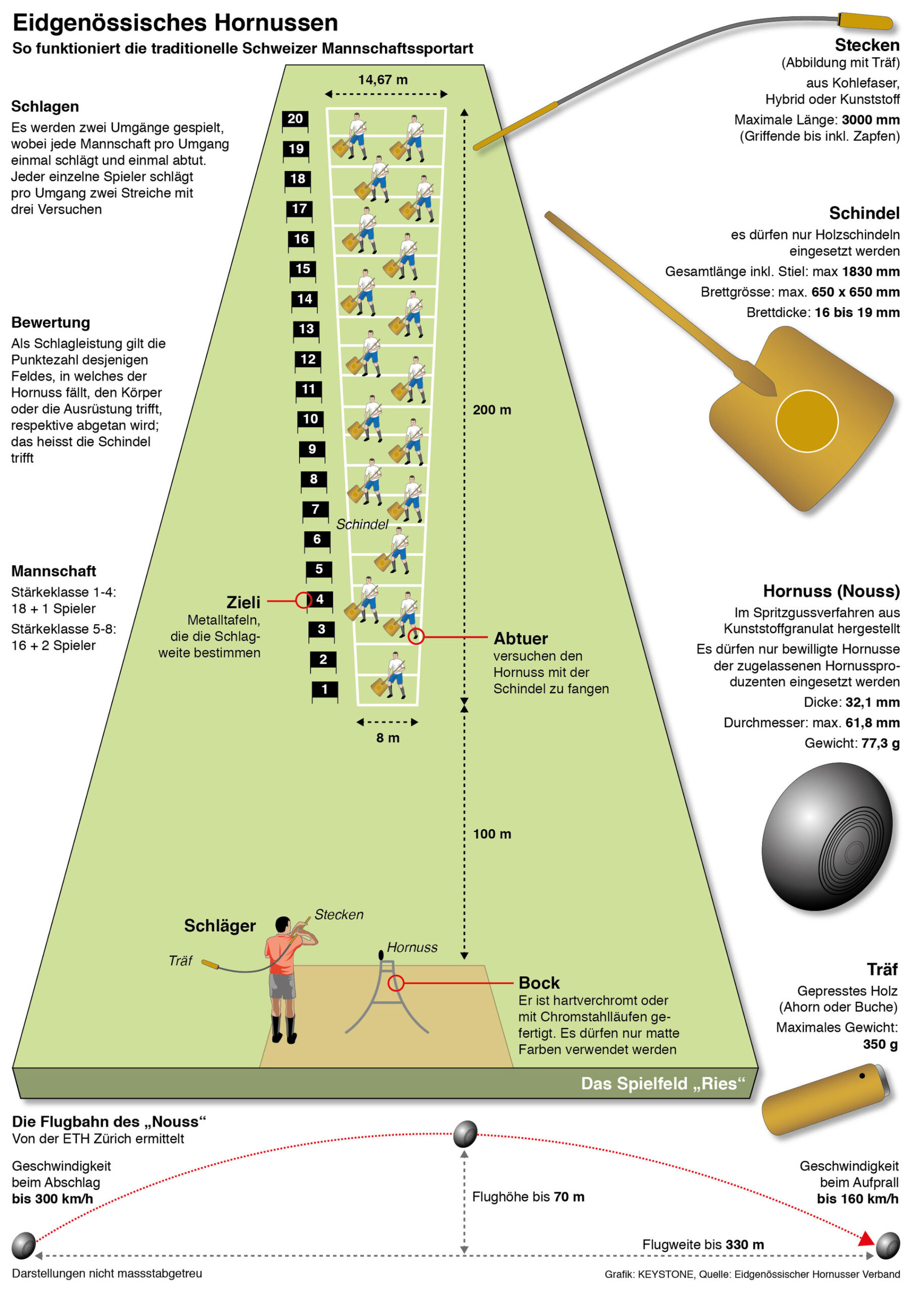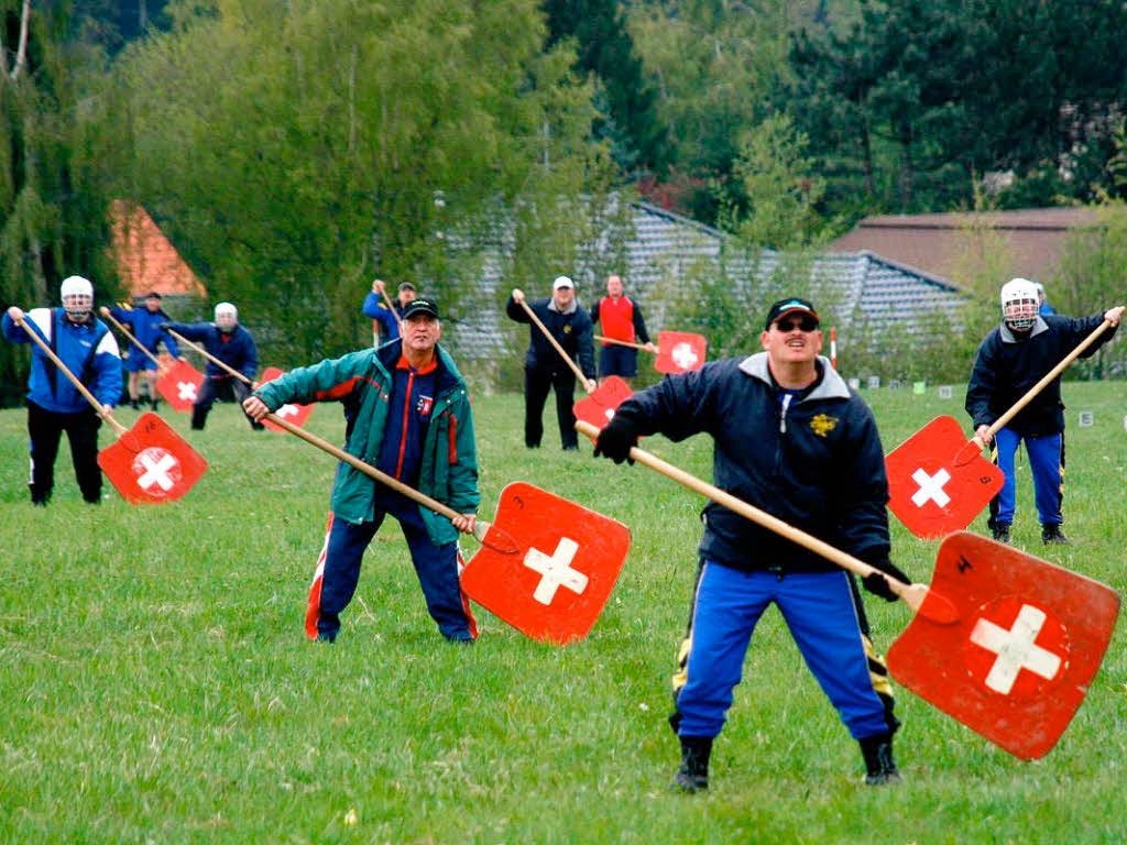 A typical Hornussen team consists of around 18 to 20 players, with both men and women participating in matches. The annual International Hornussen Festival in the Emmental region of Switzerland attracts thousands of spectators each year, with some tournaments drawing crowds of up to 10,000 people